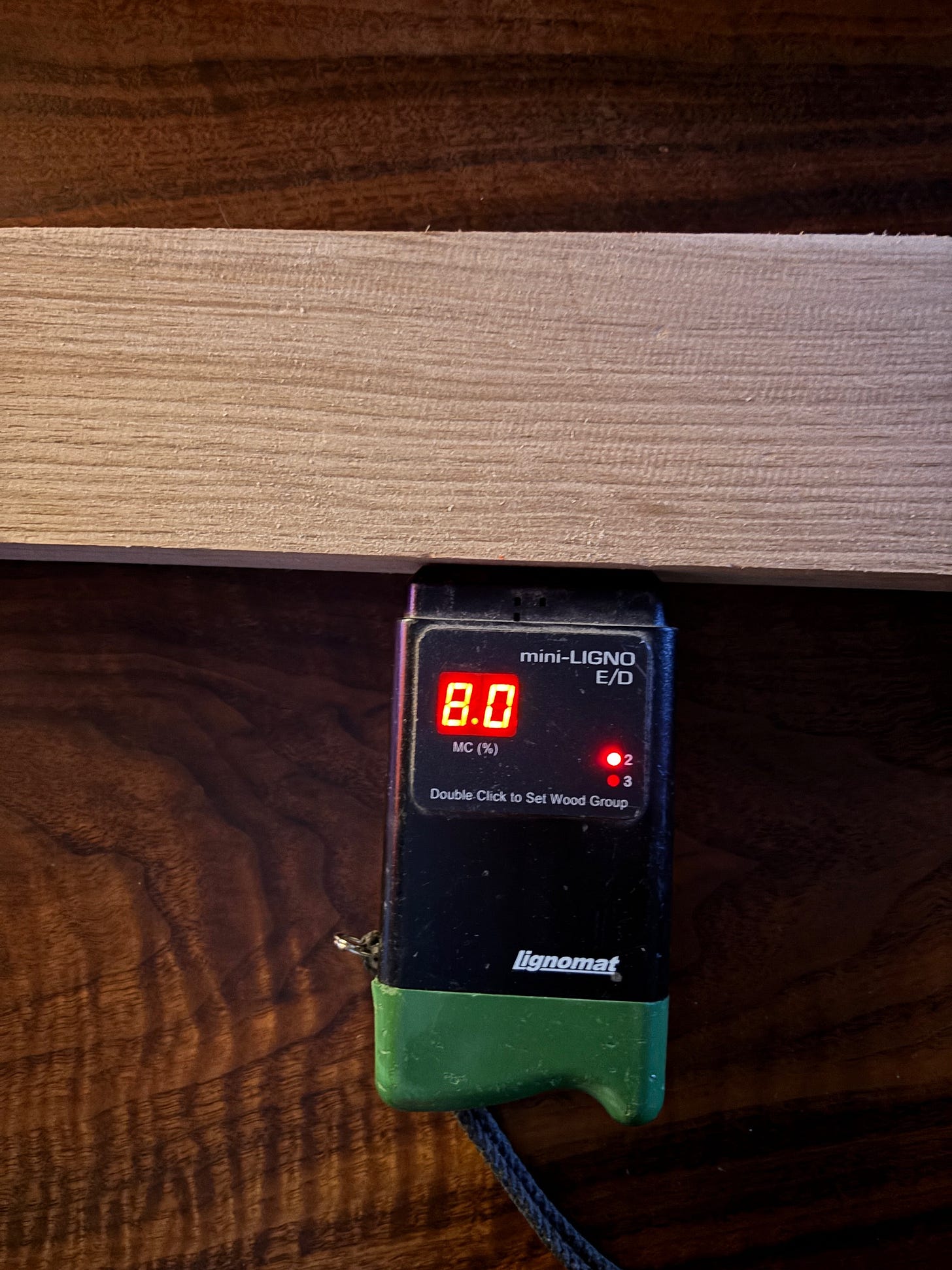 There are different pinless meters that read different depths so you will want one that reads ¾” deep if you want to confidently check moisture on 8/4 material.