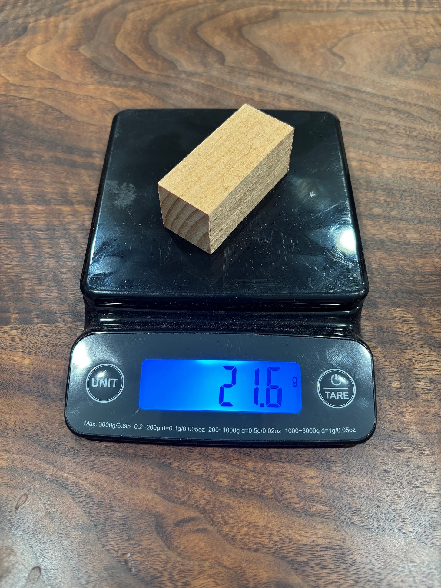 Begin by cutting a sample from the board. Ideally the sample should be 24” from the end of the board as boards dry out more rapidly from the end grain. Your sample will be very small with the ideal size being about 1”x1” cross section 2” of length with the grain. Once cut, knock off any fuzz or dust as this falling off in the oven will affect weights. Then take an initial wet weight, it’s important to take this first weight immediately, as after being exposed to the air a sample this small will immediately start drying out.