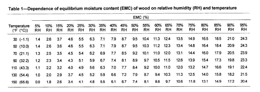 So how dry should the wood be? Dry enough to be at its EMC for the environment it will be used in. For outdoor uses we can use weather and climate data to know what wood EMC will be in that climate. The USDA has lots of data available on this.